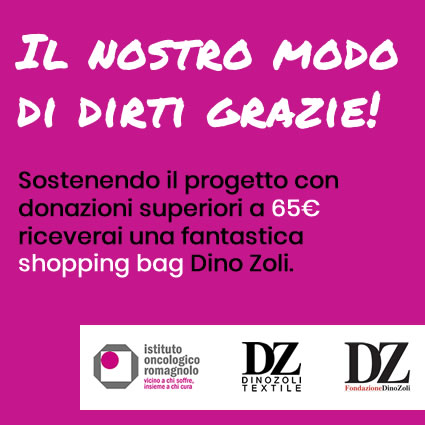Con una donazione di importo uguale o superiore a 65€ riceverai in regalo una shopper cucita a mano, realizzata in collaborazione con la Fondazione Dino Zoli e grazie al supporto della Dino Zoli Textile, che ha donato i tessuti.